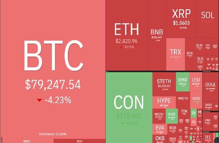 بیتکوین، بهعنوان لیدر بازار، با افت ۶.۱۴ درصدی به محدوده ۷۸ هزار دلار عقبنشینی کرد. کاهش بیش از ۵ هزار دلاری قیمت این رمزارز، سیگنال منفی قدرتمندی به بازار مخابره کرد و باعث شد سرمایهگذاران کوتاهمدت با شتاب بیشتری از بازار خارج شوند.