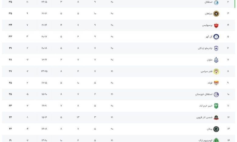 جدول لیگ برتر پس از پایان روز اول از هفته بیست و یکم
