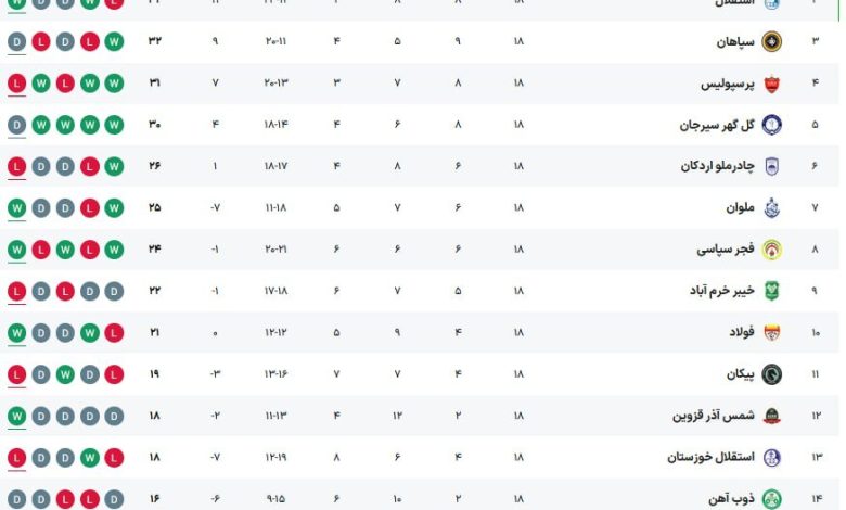 جدول لیگ برتر پس از پایان هفته هجدهم/ تراکتور صدر جدول را در اختیار گرفت